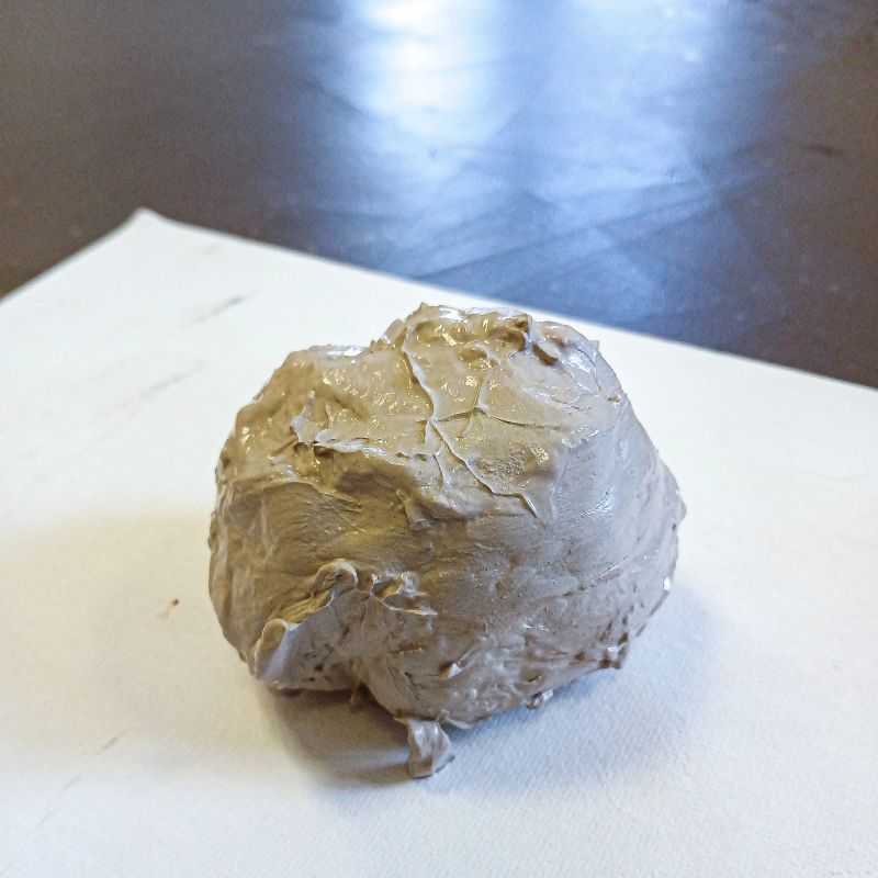 Une boule d’argile grise, fraîche, humide, sous un tissu de couleur.
